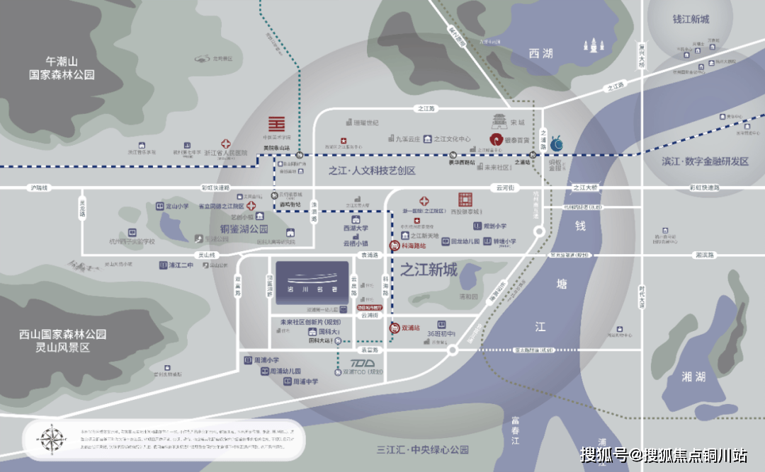上个月,《杭州市轨道交通TOD综合利用专项规划》公布,展示了“六区二十一片”TOD重点发展区,其中南部片区包含位于之江的双浦未来社区创新片区。