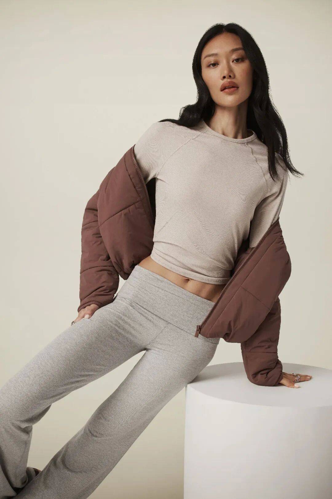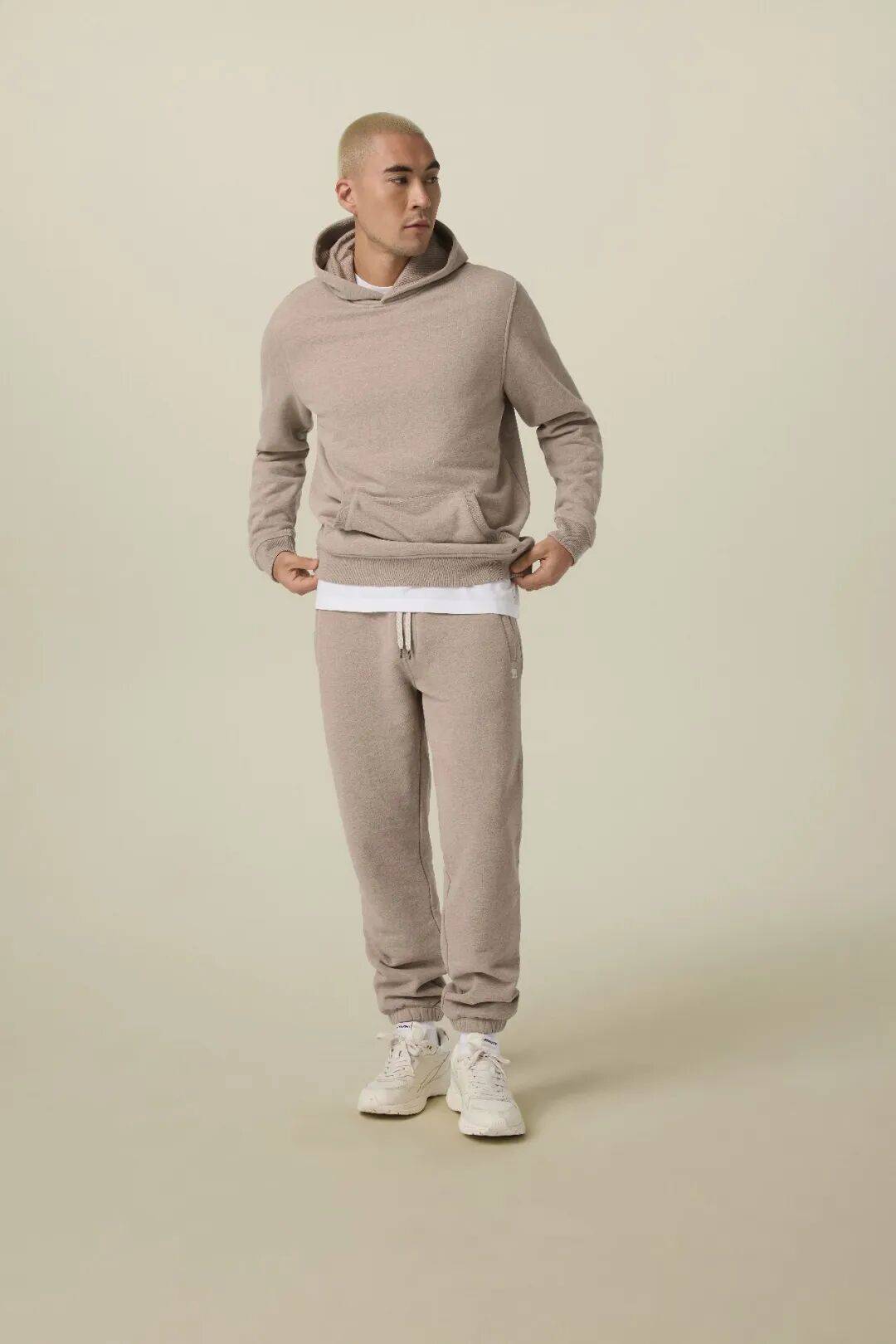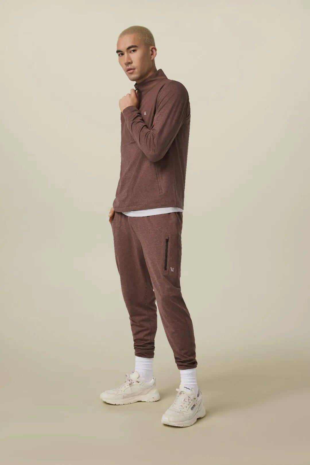 Sunday立领外套与宽松直筒运动长裤则选用“启元褐”,仿若大地初醒的温润色泽,传递出沉稳而亲和的力量。