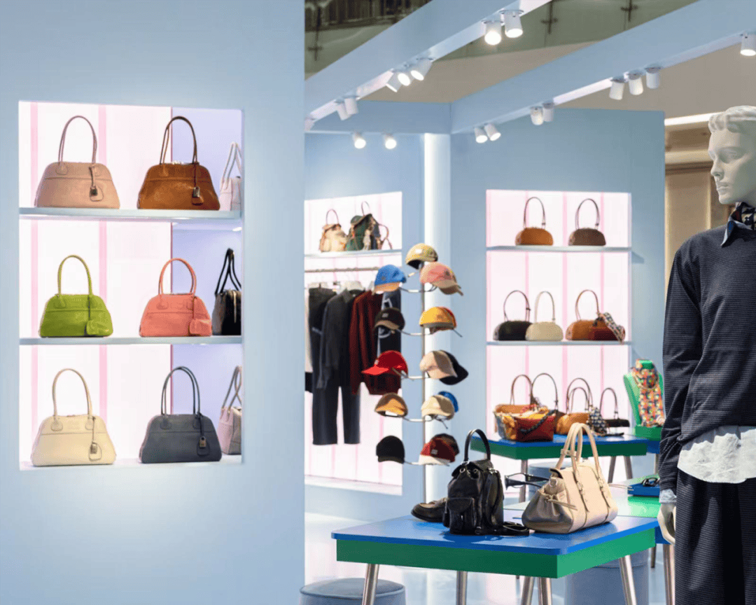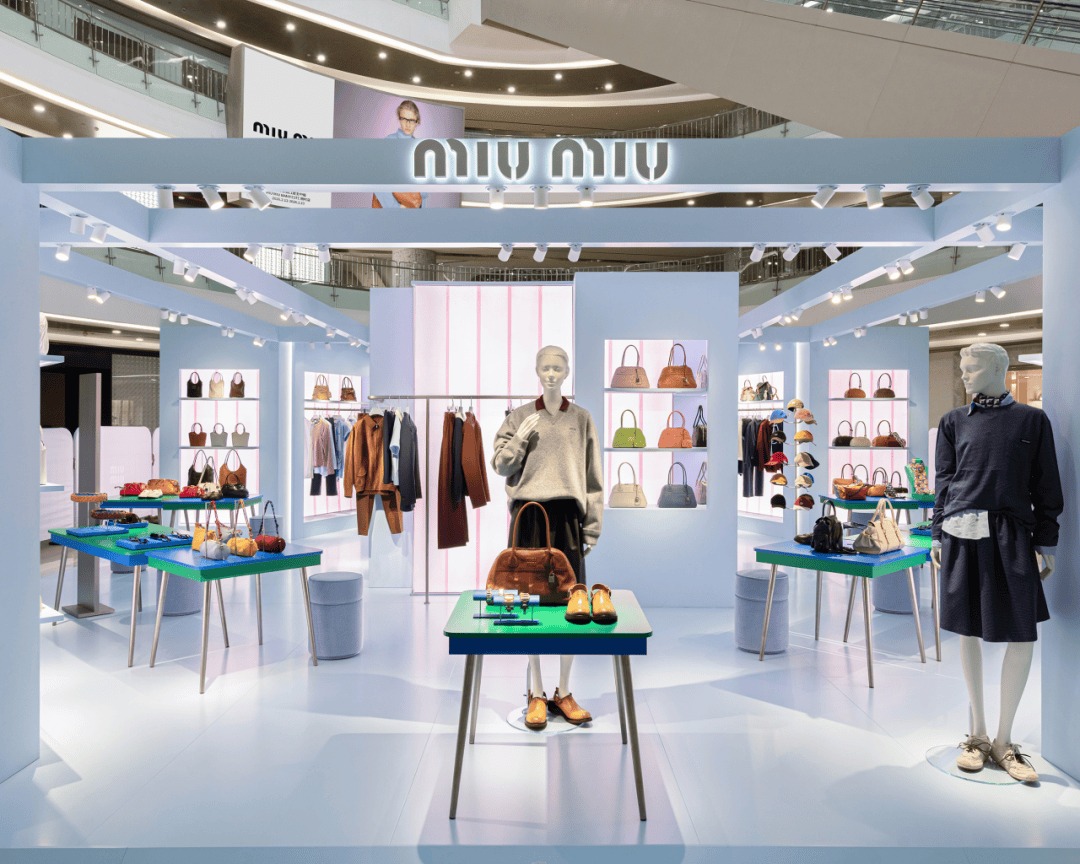 限时店以品牌标志性浅蓝色为主调,缀以粉色细节,在定制化空间布景中,陈列着尽显Miu Miu至臻本真风格的全系列服饰。